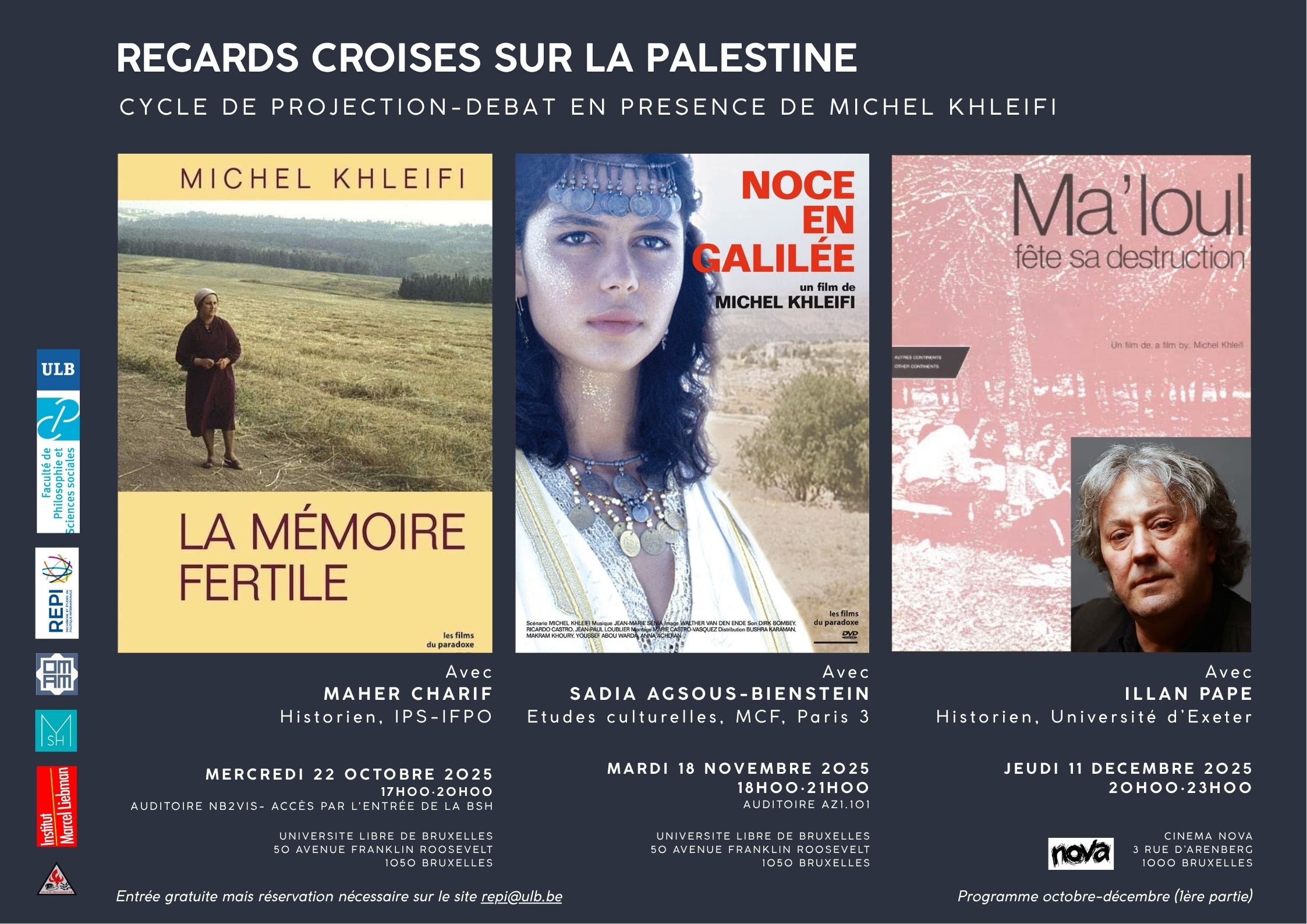 Séance 1 – 22 octobre, 17h à 20h : « La mémoire fertile » avec Maher Charif (historien, IPS-IFPO), à l’ULB (salle de Vision), Gratuit, ouvert à tou.tes. Présentation du film et de Maher Charif sur :https://phisoc.ulb.be/fr/agenda-facultaire/histoire-moderne-de-la-palestine-quelques-reperes-1 (Inscription souhaitée : https://forms.office.com/e/g4dZ8vr0Bd?origin=lprLink)